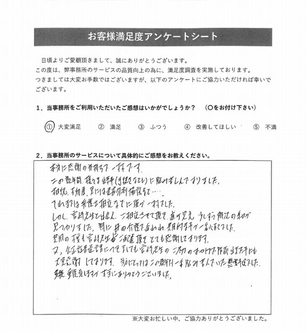 突然の「遺言書検認申立」の連絡以降、音信不通だった被相続人の死亡確認等で精神的にも厳しい状態下、想定されるリスクにつき、専門家として適切なアドバイスを下さり、また、相続放棄に必要な書類の丁寧な説明を頂き、無事に期限内に手続を完了出来ました。本当にありがとうございました。