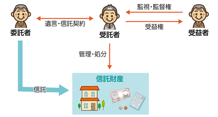 信託とは、財産の所有者が、信託行為(遺言・信託契約等)によって、信頼できる人に対して財産を託し、誰かのためにその財産の管理・処分を任せる仕組みを指します。