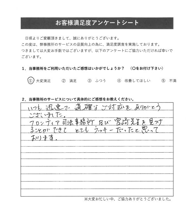 お客様の声002 投稿日2022年2月9日 1.当事務所をご利用いただいたご感想はいかがでしょうか? 大変満足 2.当事務所のサービスについて具体的にご感想をお教えください。 いつも迅速で適確なご対応をありがとうございました。 フロンティア司法事務所及び宮崎先生を見つけることができてとてもラッキーだったと思っております。
