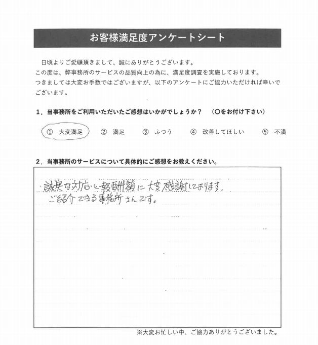 お客様の声007 投稿日2022年9月28日 1.当事務所をご利用いただいたご感想はいかがでしょうか? 大変満足 2.当事務所のサービスについて具体的にご感想をお教えください。 誠実な対応と報酬額に大変感謝しております。 ご紹介できる事務所さんです。