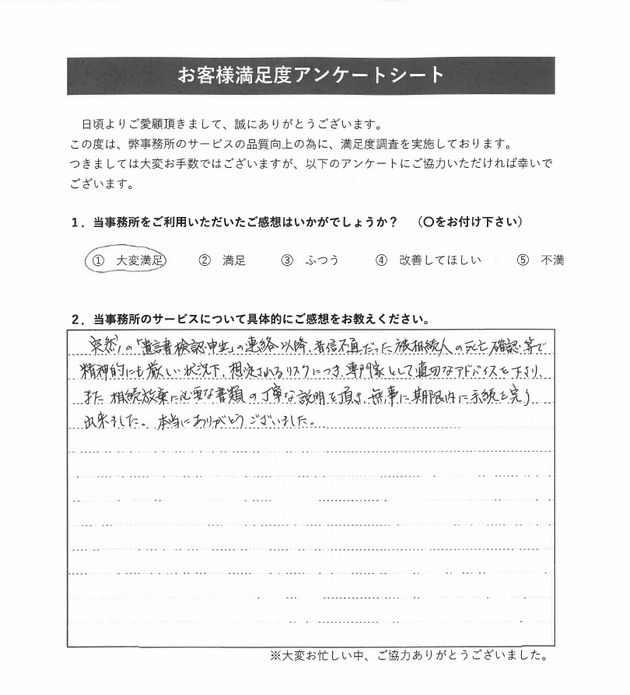 突然の「遺言書検認申立」の連絡以降、音信不通だった被相続人の死亡確認等で精神的にも厳しい状態下、想定されるリスクにつき、専門家として適切なアドバイスを下さり、また、相続放棄に必要な書類の丁寧な説明を頂き、無事に期限内に手続を完了出来ました。本当にありがとうございました。