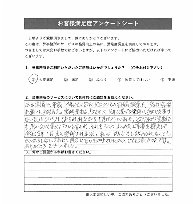 ある事情で、平成14年に亡くなった父についての相続放棄を令和1年12月お願いにあがりました。宮﨑先生は「さすがに16年も経っている案件は、手がけた事はないな」とびっくりしておられましたが引き受けてくださいました。どんな小さな資料でも、思い出して集めてくださいと言われ、それをもとにまとめた上申書を提出して令和2年1月末に受理されました。私は、内心もし認められなくてもがっかりしない様にと自分に言いきかせていたので、とてもうれしかったです。